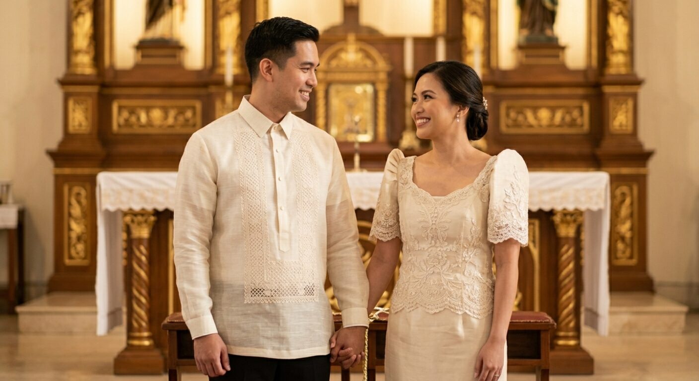 In a Filipino wedding, the Barong Tagalog is the centerpiece of the “Pamanhikan” and the ceremony itself. It is the masculine counterpart to the bride’s intricate Filipiniana or Mestiza dress.