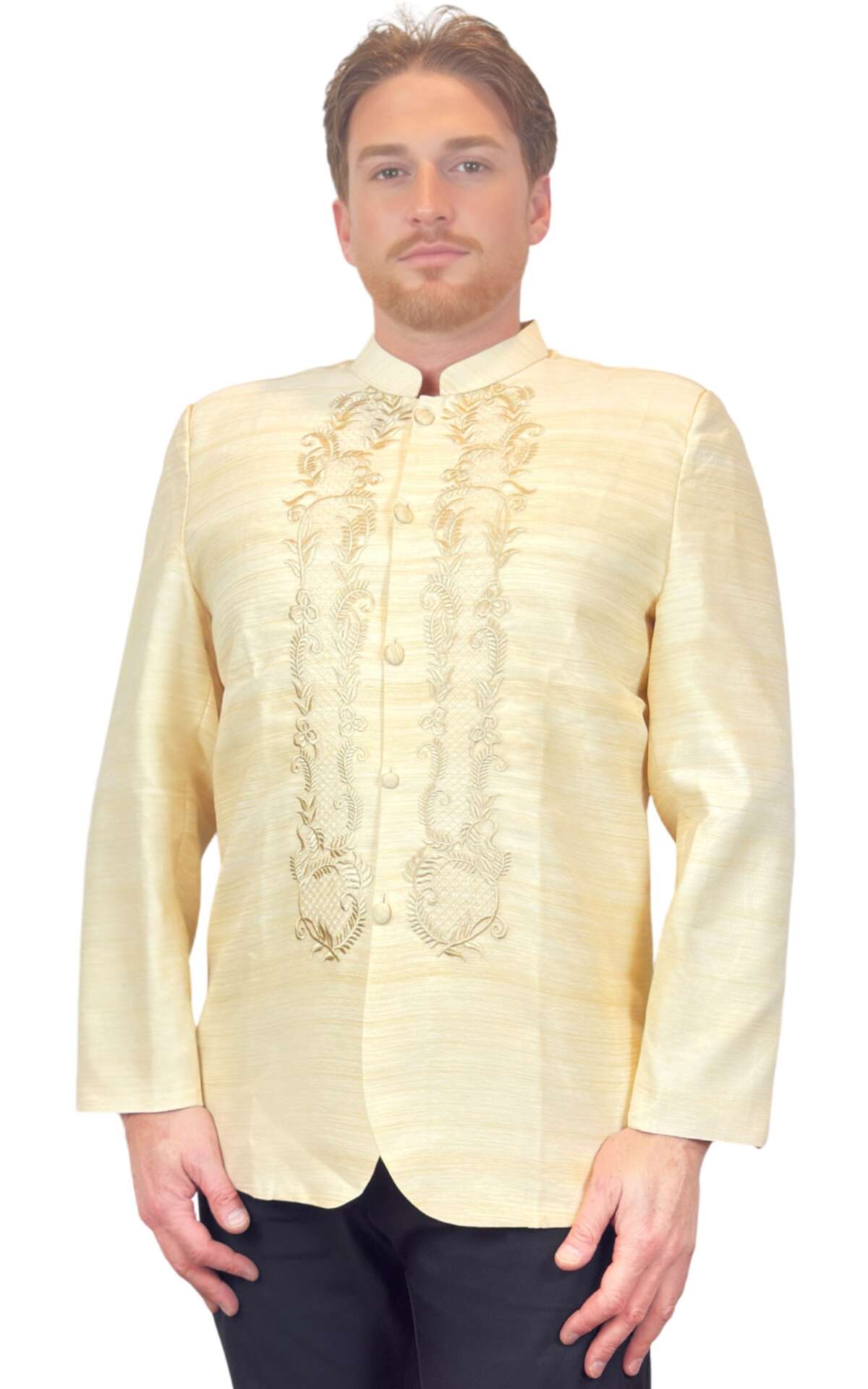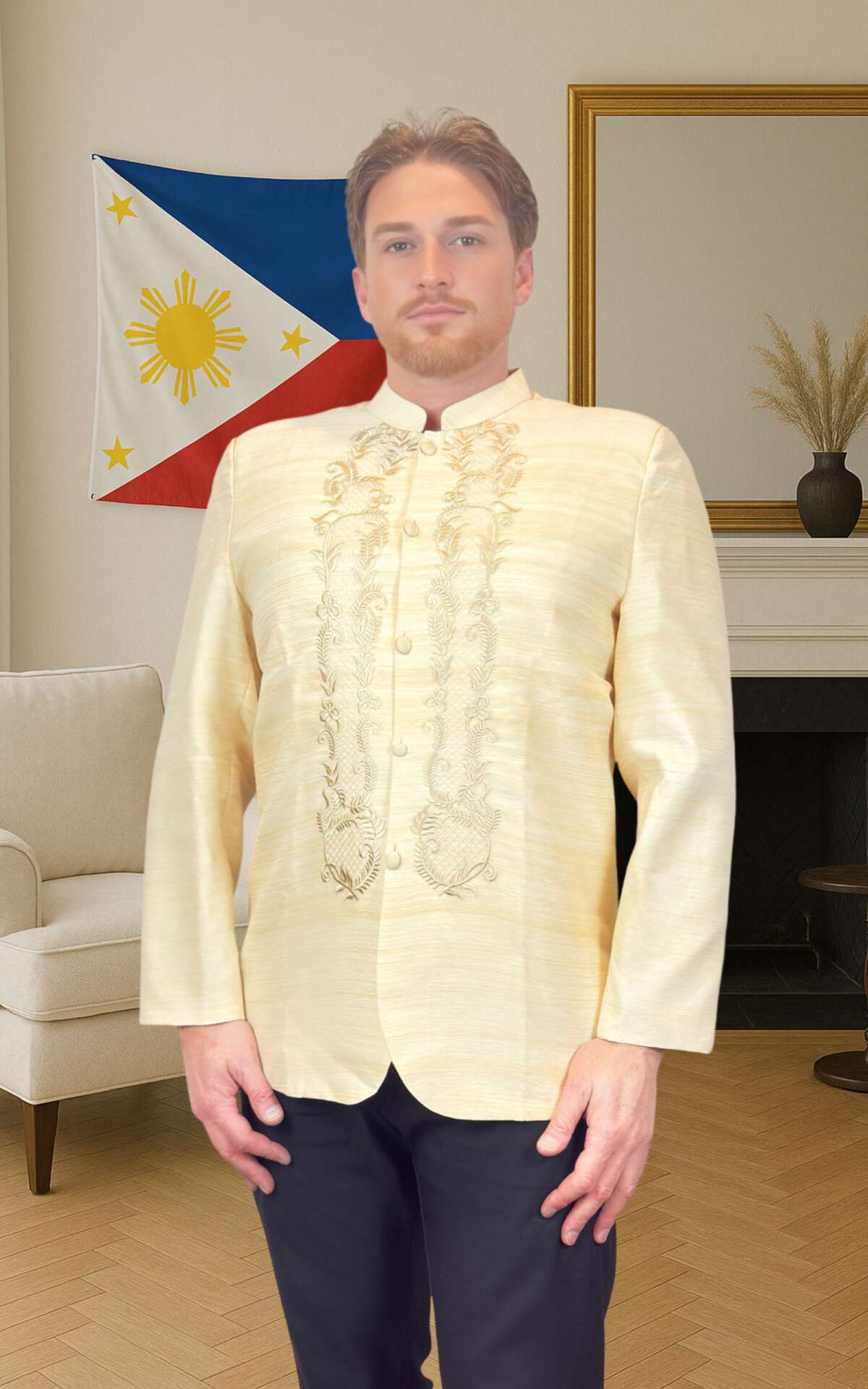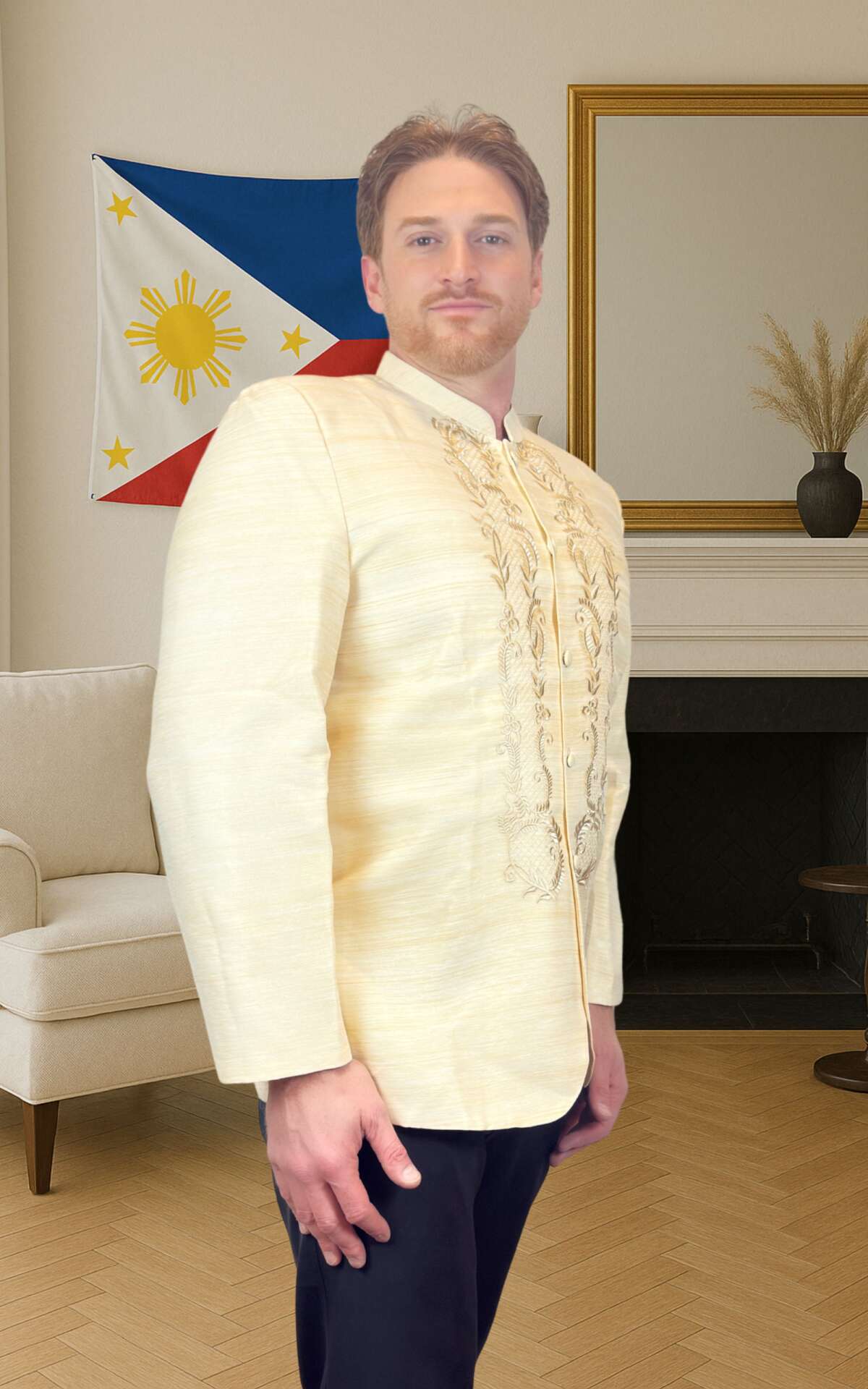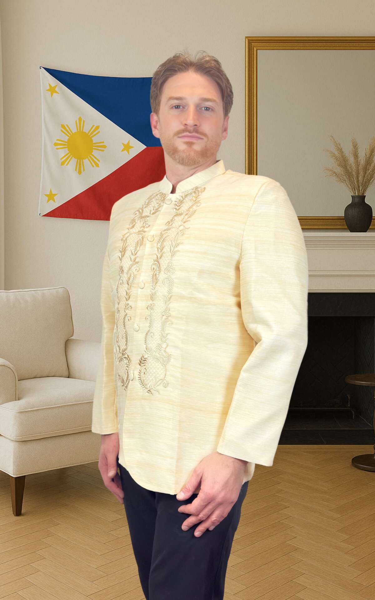 The Modern Barong Coat for Men offers a stylish, contemporary twist on the classic Filipino Barong Tagalog. This elegant piece features: